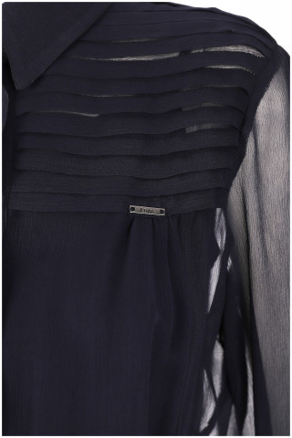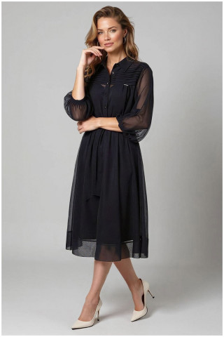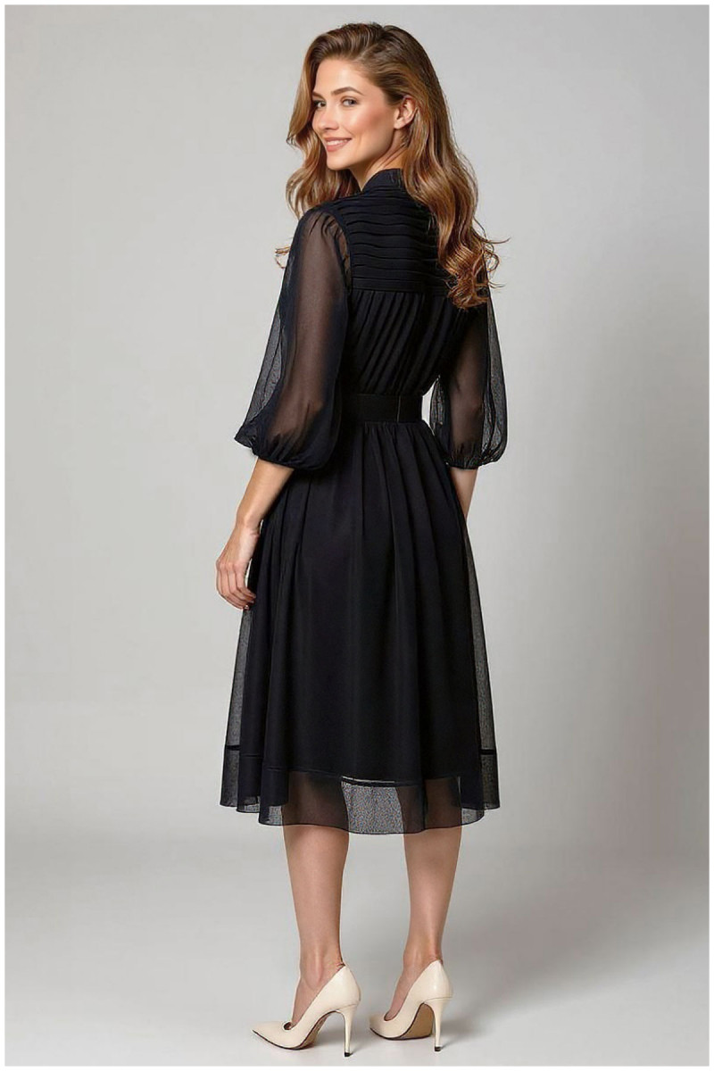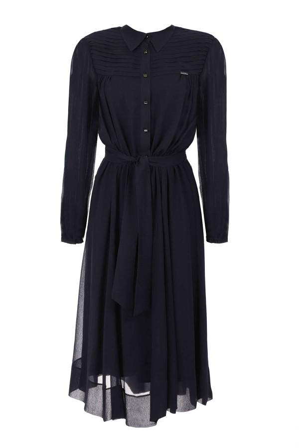 Elegantna midi haljina u teget boji dugih rukava. Prijatan materijal i lepršavi kroj pružaju udobnost prilikom nošenja. Haljina ima klasičnu kragnu, diskretne nabore na gornjem delu i podesivi pojas koji naglašava struk.