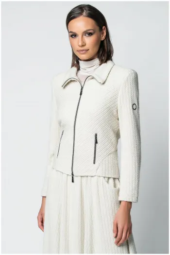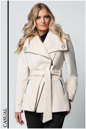 Moderna jakna sa dvopoteznim rajsferšlusom i kaišem na vezivanje koji naglašava struk.