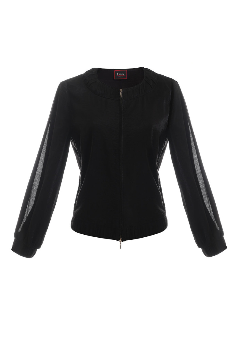 Atraktivna "bomber" jakna od pamučne tkanine sjajnog izgleda. Klasičan kroj jakne svaku Vašu odevnu kombinaciju dodatno će učiniti modernijom i atraktivnijom. Ova jakna u mnogim prilikama može zameniti i formalni sako. Dvostrani rajsferšlus možete podesiti po Vašoj potrebi, pa tako jaknu možete otkopčati i sa donje strane.