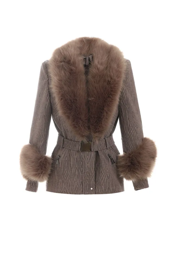 Elegantna kratka jakna sa krznom oko vrata i zglobova. Napravljena je od efektnog reljefastog materijala sa visokim procentom elastina zbog čega je odličan izbor zbog čega je veoma prijatna za nošenje. Uz pomoć kaiša možete naglasiti struk.