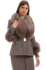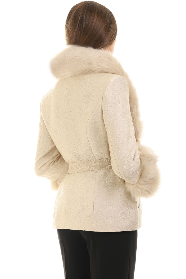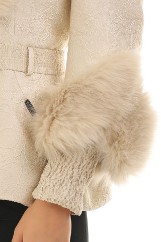 Elegantna kratka jakna sa krznom oko vrata i zglobova. Napravljena je od efektnog reljefastog materijala. Visok procenat elastina u postavi čini je veoma prijatnom za nošenje. Uz pomoć kaiša možete naglasiti struk.