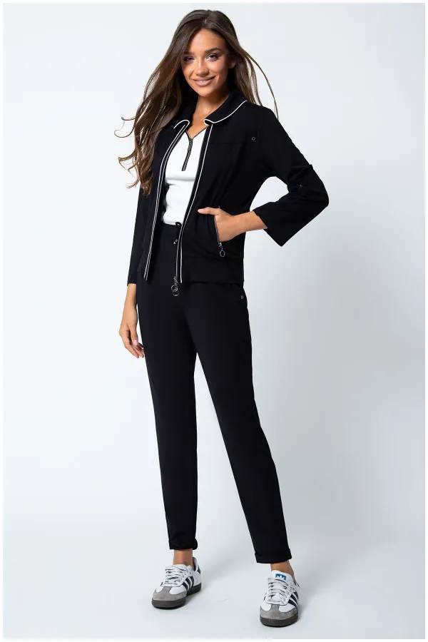 Kratka i moderna jakna sa kontrasnim detaljima i dvopoteznim rajsferšlusom u crnoj boji. Odlično se kombinuje sa donjim delovima trenerke iz iste kolekcije. Model poseduje visok procenat elastina u svom sastavu što ga čini veoma udobnim.