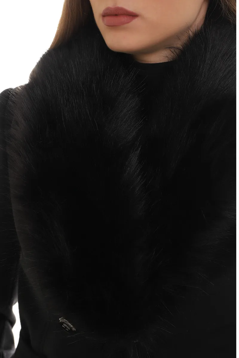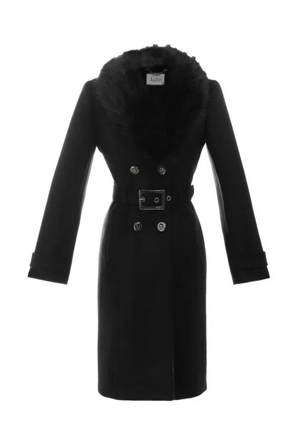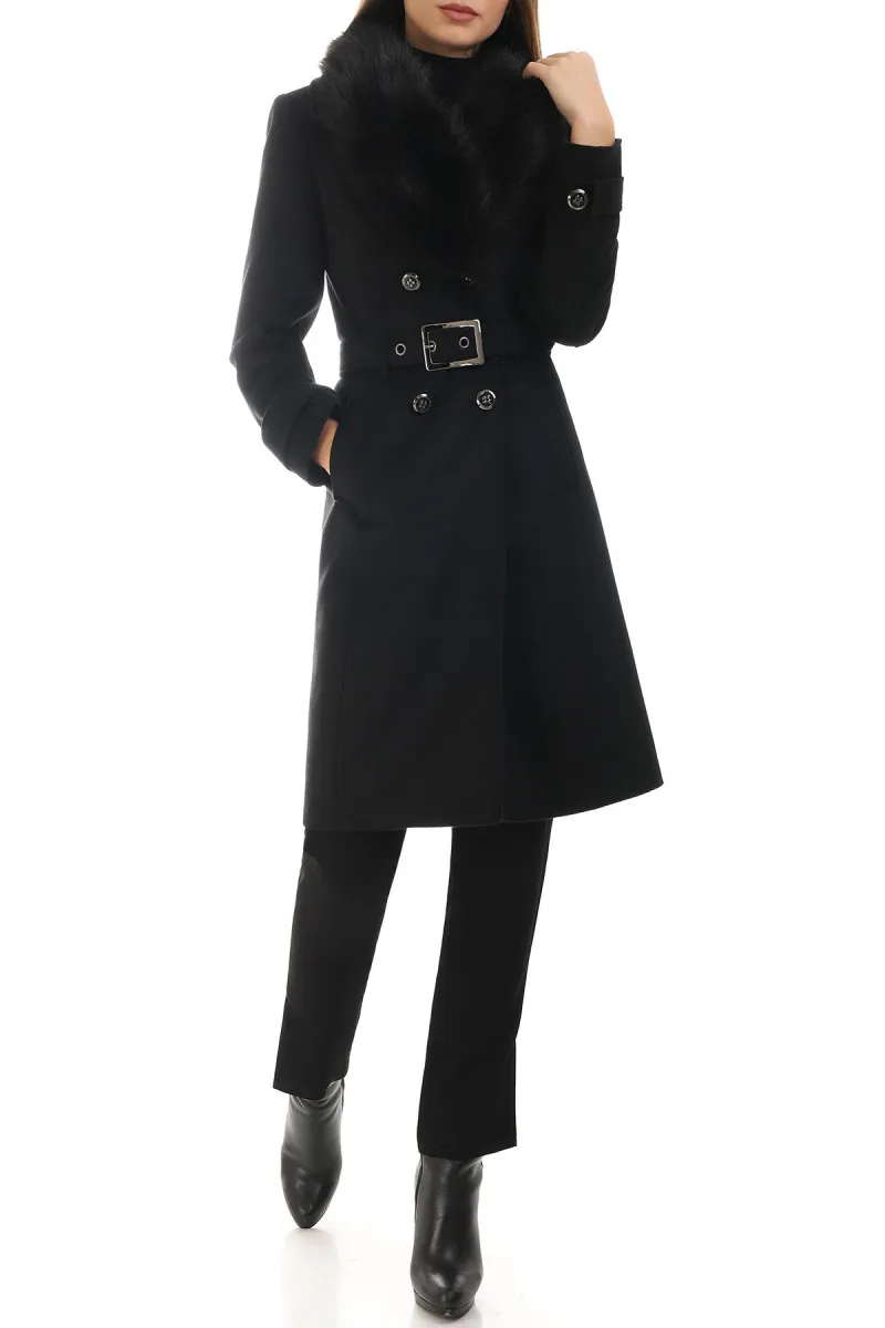 Elegantni strukirani kaput u crnoj boji, sa eko krznom oko vrata, dodaje notu sofistici...