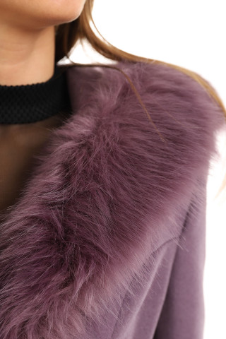 Elegantni strukirani kaput u crnoj boji, sa eko krznom oko vrata, dodaje notu sofistici...