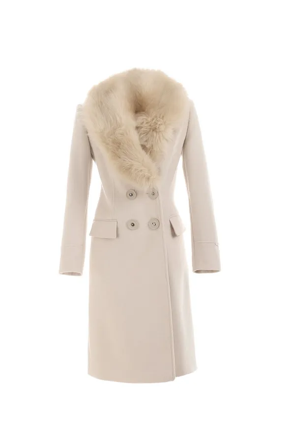 Elegantan dugi kaput u bež boji, sa eko krznom oko vrata, dodaje notu sofisticiranosti ...