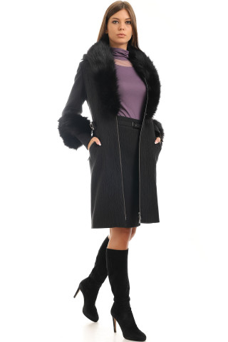 Elegantni strukirani kaput u klasičnoj crnoj boji, sa eko krznom oko vrata i rukavima, ...