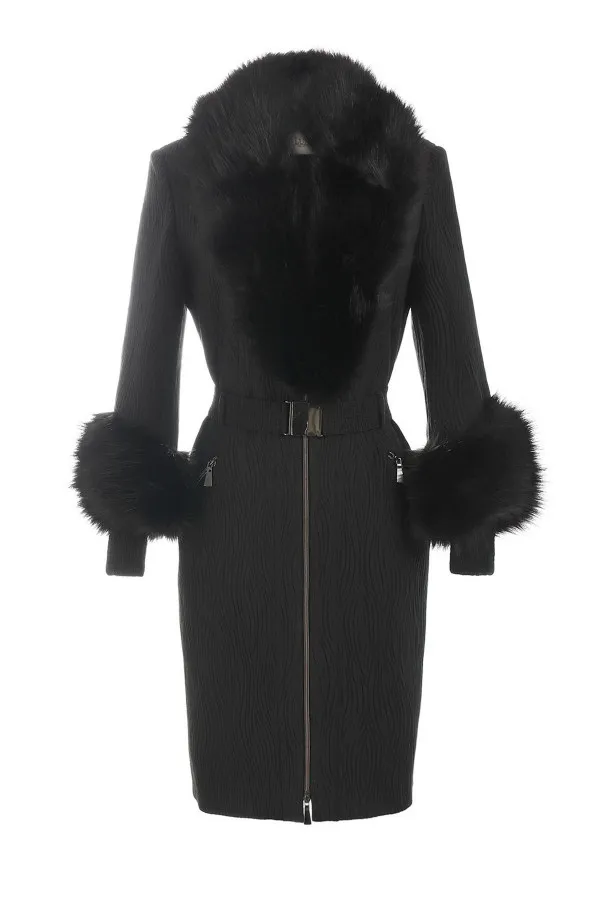 Elegantni kaput sa krznom oko vrata i zglobova. Napravljen je od reljefastog materijala sa elastinom što ga čini veoma prijatnim za nošenje. Uz pomoć kaiša možete naglasiti svoj struk. Šlic omogućava lako kretanje.