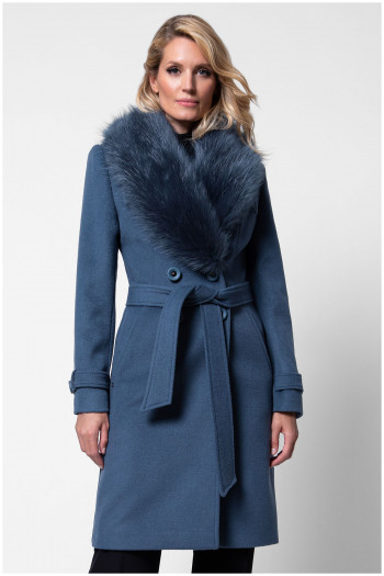 Elegantan dugi kaput u teget boji sa eko krznom oko vrata, dodaje notu sofisticiranosti...