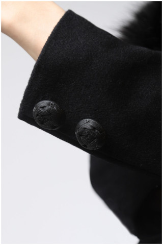 Elegantni strukirani kaput u crnoj boji, sa eko krznom oko vrata, dodaje notu sofistici...