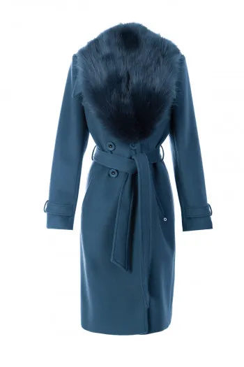 Elegantni petrolej-plavi kaput sa luksuznom krznenom kragnom, prijatnim materijalom i i...