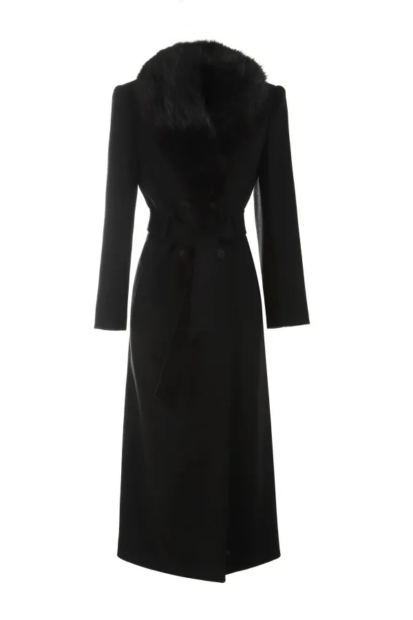 Elegantni strukirani kaput u klasičnoj crnoj boji, sa eko krznom oko vrata i rukavima, ...