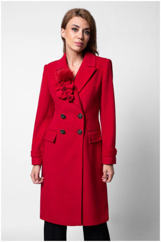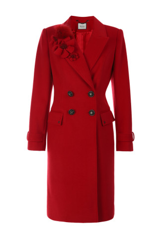 Crveni kaput dužine ispod kolena sa džepovima na preklop i kragnom s nazubljenim reverima.