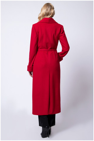 Elegantni dugi kaput u crvenoj boji sa širokom kragnom i kaišem. Kroj prati liniju tela i pruža sasvim dovoljno prostora da se u njemu osećate veoma komforno. Model poseduje dvoredno kopčanje na preklop.