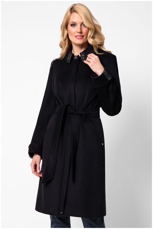 Kratki crni kaput sa detaljima na kragni i rukavima. Liniju kopčanja krase skriveni dirker dugmad i dvopotezni rajsferšlus. Uz pomoć pojasa na vezivanje možete ga zategnuti po svojoj meri. Model poseduje dva bočna džepa i šlic na donjem rubu pozadi.