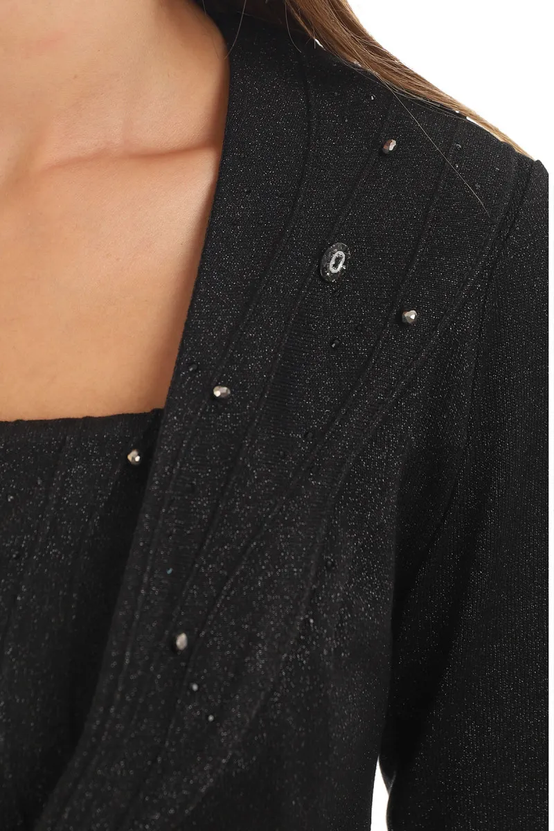 Crni kardigan sa metaliziranim vlaknima i visokim procentom elastina u materijalu.