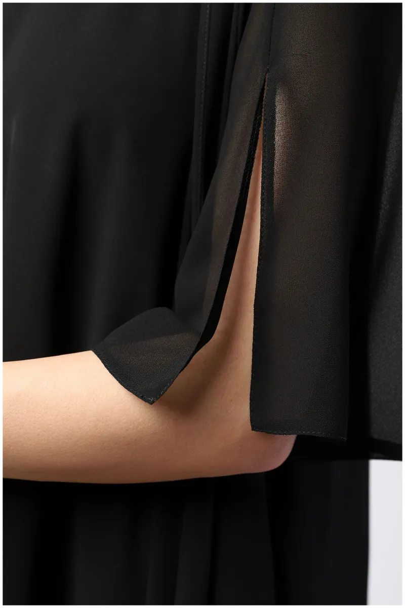 Lagani crni kardigan sa 3/4 rukavima. Širok kroj čini ga pogodnim za sve tipove građe. Idealan je za kombinovanje sa haljinama iz iste linije.
