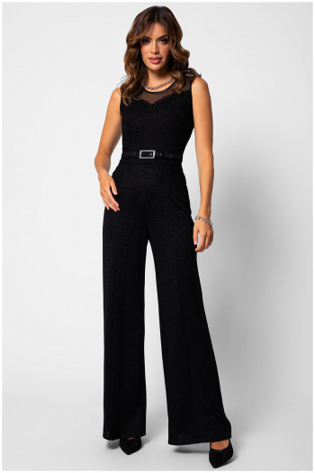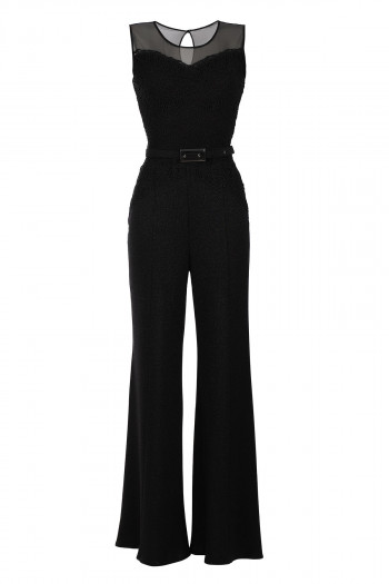 Elegantan crni kombinezon oplemenjen čipkastim dezenom, idealan za posebne prilike.