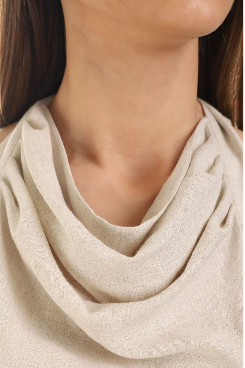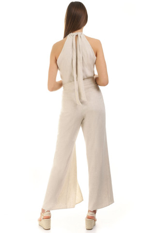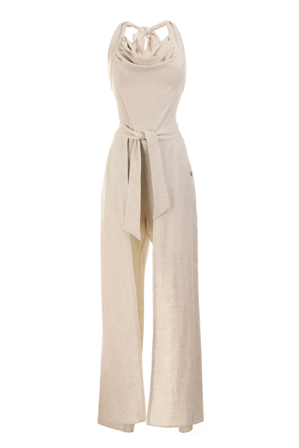 Bež kombinezon od prirodnih materijala. Širok kroj sa naborima će odlično pristajati svim tipovima građe. Pojas, kao i predeo vrata koji se vezuju omogućavaju da prilagodite ovaj model svojim proporcijama. Iskombinujte ga sa omiljenim cipelama i torbicom i spremni ste za izlazak.