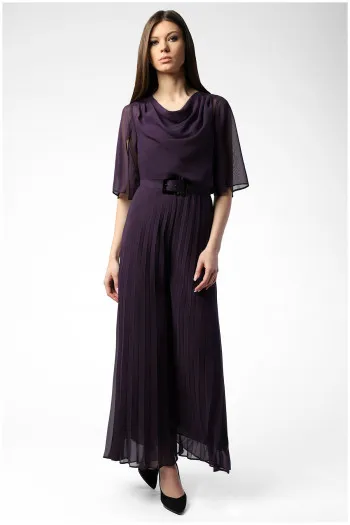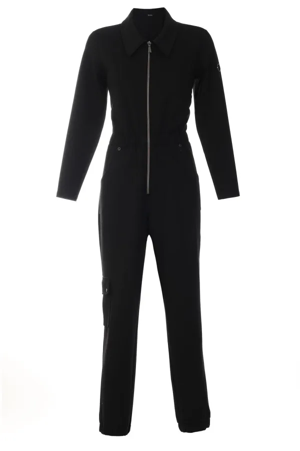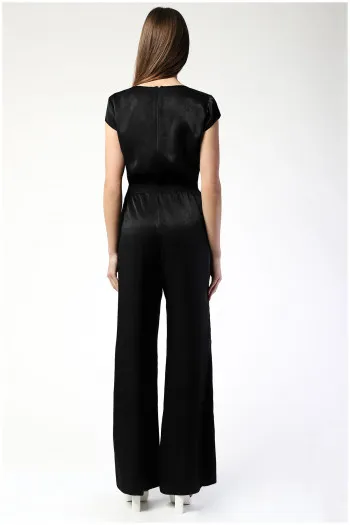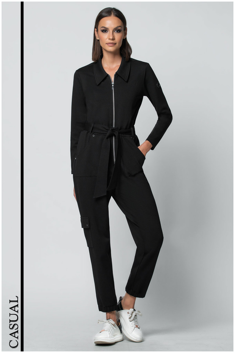 Kombinezon u crnoj boji sa kaišem na vezivanje savršeno prati liniju tela i ističe struk. Viskozni materijal vrlo je prijatan na koži. Dubinu dekoltea možete podešavati uz pomoć rajsferšlusa.