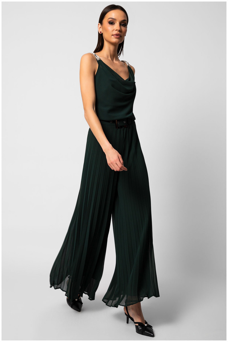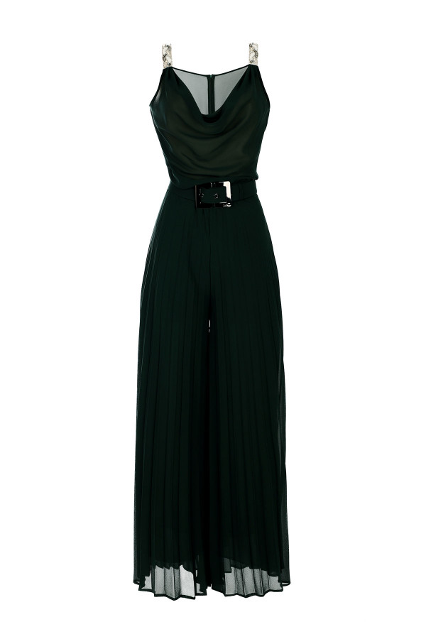 Prefinjen tamnozeleni kombinezon sa čipkanim gornjim delom, diskretnim zakopčavanjem, s...