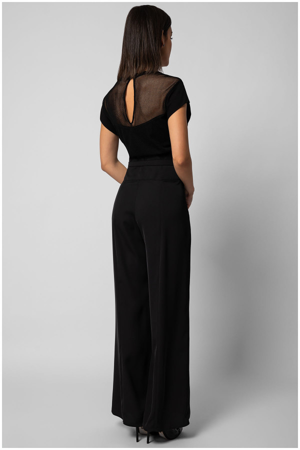Elegantni crni kombinezon sa kaišem idealan je spoj udobnosti i elegancije i uz njega ćete ostaviti snažan utisak. Gornji deo kombinezona je obogaćen jedinstvenim providnim detaljem. Zvonasti kroj nogavica čini ovaj model izuzetno komfornim. Uz efektan nakit, torbu i Luna cipele dobićete savršen outfit za svečane prilike.