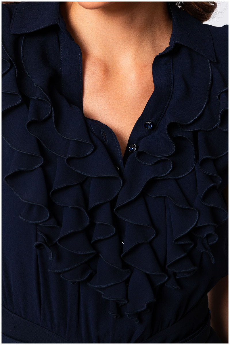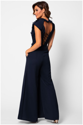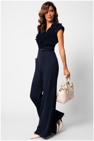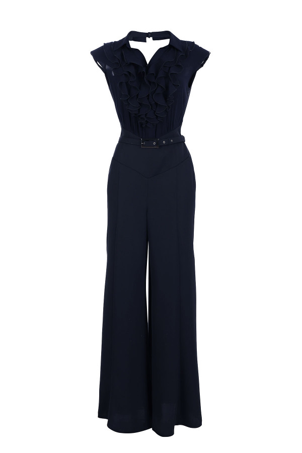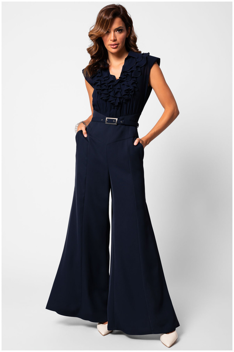 Elegantni teget kombinezon oplemenjen naborima u predelu biste. Transparentna leđa kao i ukrštene trake dodaju notu zavodljivosti i atraktivnosti. Kaiš sa ukrasnom šnalom dodatno naglašava struk. Zvonasti kroj nogavica čini ovaj model izuzetno komfornim.