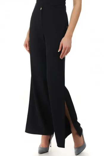Crne elegantne pantalone ravnog kroja sa bočnim prorezima, laganim padom i glatkom, pri...