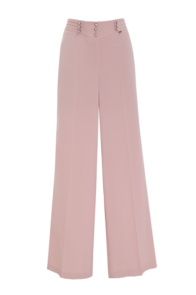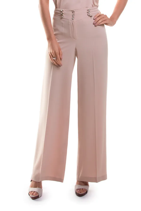Elegantne pantalone dubokog pojasa i blago zvonastih nogavica odličan su izbor kako za poslovne tako i svečane prilike. Blaga doza elastina ovom modelu pruža osećaj potpune udobnosti. Posebnu notu glamura pružaju ukrasni dugmići na pojasu. Lako se kombinuju sa raznim dezenima i modelima iz Luna asortimana.