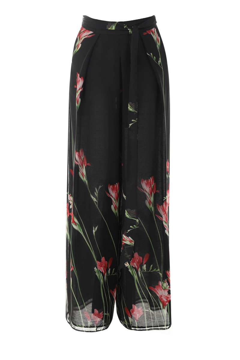 Lepršave pantalone cvetnog dezena sa bočnim džepovima i rastegljivim pojasom.