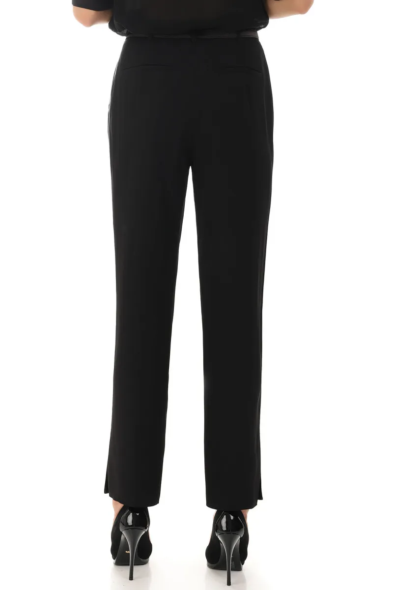 Crne elegantne pantalone ravnog kroja sa bočnim prorezima, laganim padom i glatkom, pri...