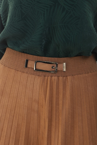 Atraktivne plisirane pantalone šireg kroja u kamel boji. Rastegljivi pojas sa ukrasnom šnalom kao i visok procenat elastina u materijalu doprineće osećaju komfora. Možete ih nositi uz razne odevne komade, ravnu ili obuću sa potpeticom i uvek ćete izgledati ženstveno, šarmantno i urbano.
