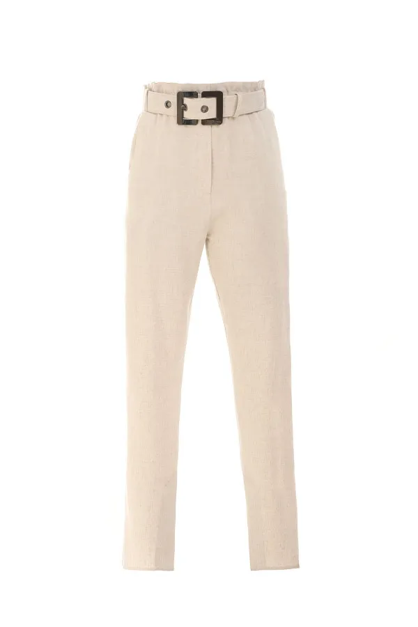 Elegantne bež pantalone sa visokim strukom, prefinjenim krojem i modernim rasporom na n...