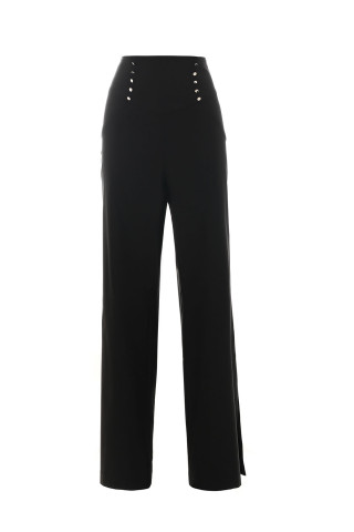 Crne elegantne pantalone ravnog kroja sa bočnim prorezima, laganim padom i glatkom, pri...