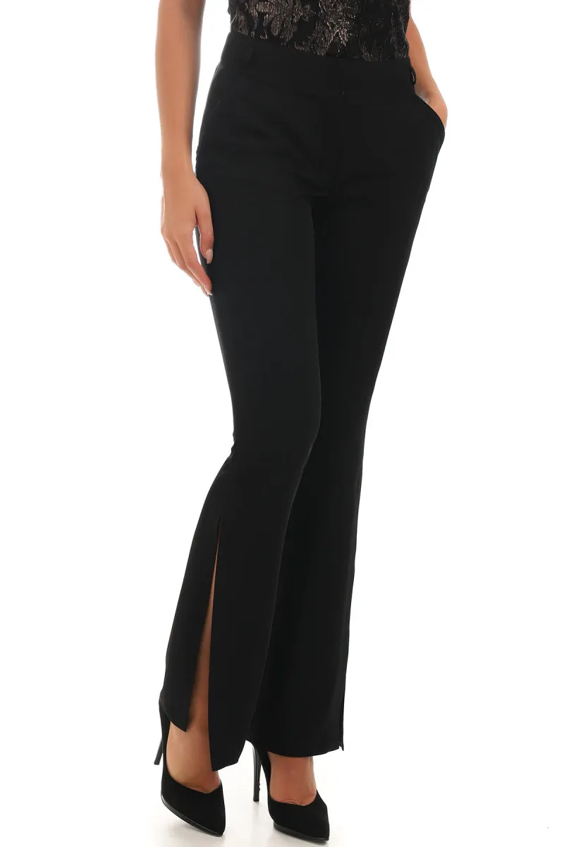 Crne elegantne pantalone ravnog kroja sa bočnim prorezima, laganim padom i glatkom, pri...