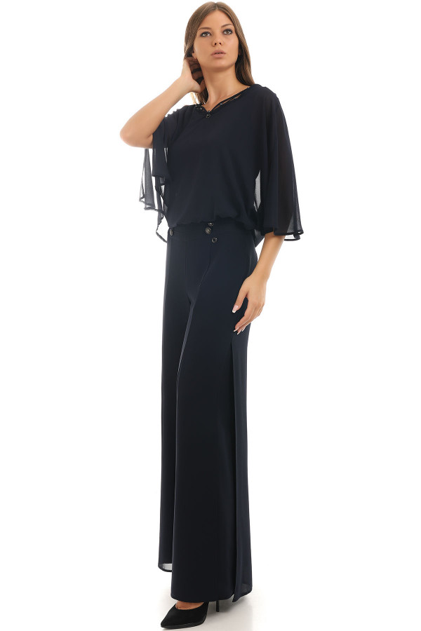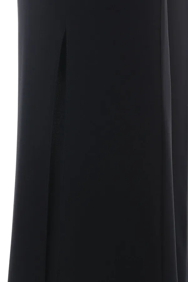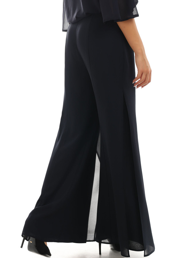 Crne elegantne pantalone ravnog kroja sa bočnim prorezima, laganim padom i glatkom, pri...