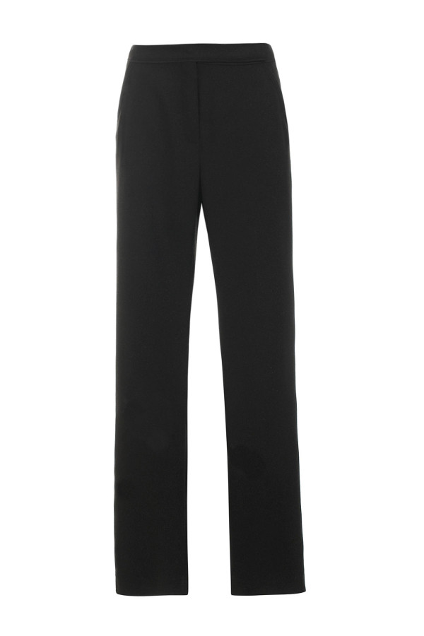 Crne elegantne pantalone ravnog kroja sa bočnim prorezima, laganim padom i glatkom, pri...