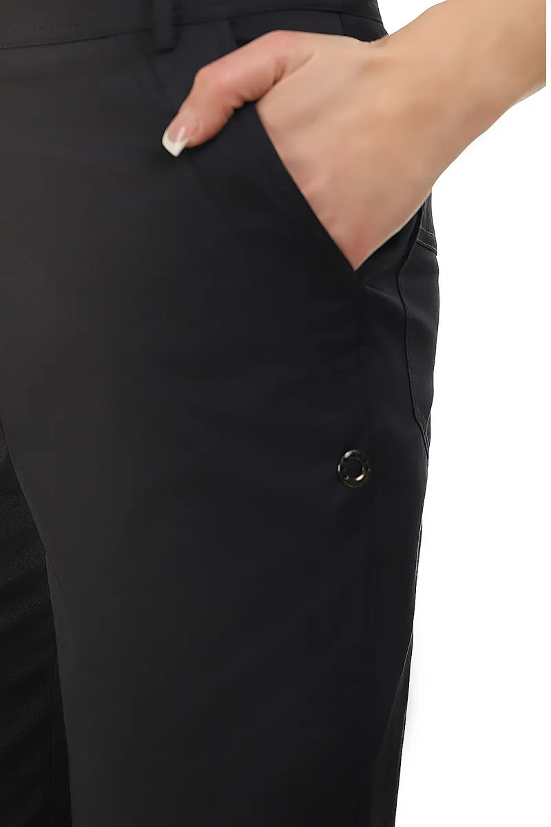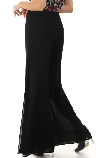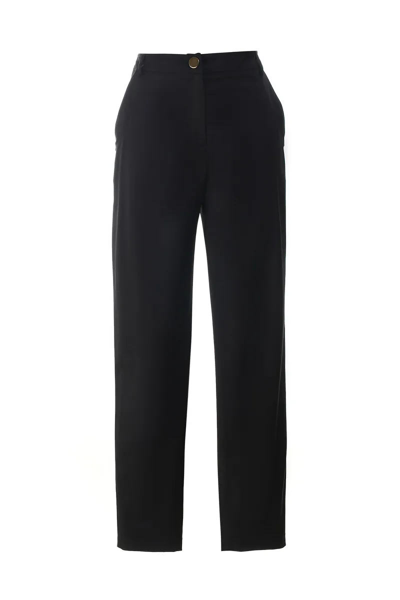Crne elegantne pantalone ravnog kroja sa bočnim prorezima, laganim padom i glatkom, pri...