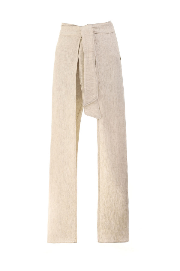 Lagane bež pantalone sa kaišem. Savršena kombinacija prirodnih materijala kreirala je model koji je idealan za tople letnje dane. Pored velike doze komfora, pomoći će Vam da jednostavno kreirate outfite kako za svečane, tako i za ležerne prilike.
