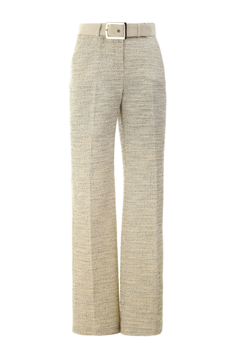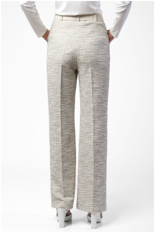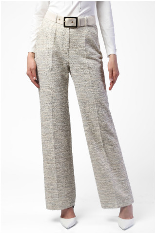 Bež-zlatne pantalone šireg kroja sa bež kaišem. Nogavice se blago šire. Lame vlakna protkana su kroz ceo model. Visok procenat elastina donosi dozu komfora i čini ih prijatnim za nošenje. Odaberite adekvatne cipele i sakon ili mantil iz iste kolekcije kako biste kompletirali svoj poslovni outfit.