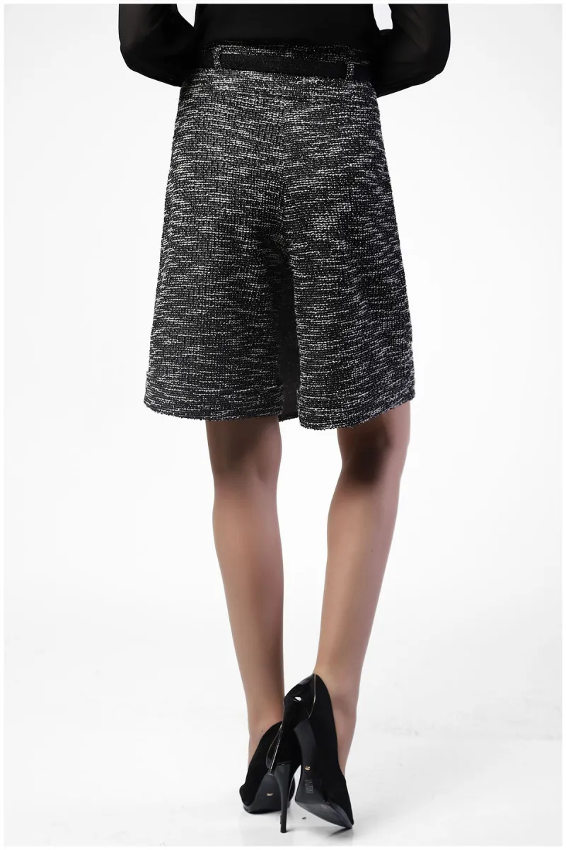 Elegantni crni šorts dužine do kolena. Šlic falta sa prednje strane vizuelno kreira izgled suknje. Lame vlakna protkana su kroz ceo model i čine ga efektnim. Širok kroj i visok procenat elastina čini ga vrlo komfornim za nošenje i pogodnim za sve tipove građe. Idealan je za kombinovanje sa sakoom iz iste kolekcije.