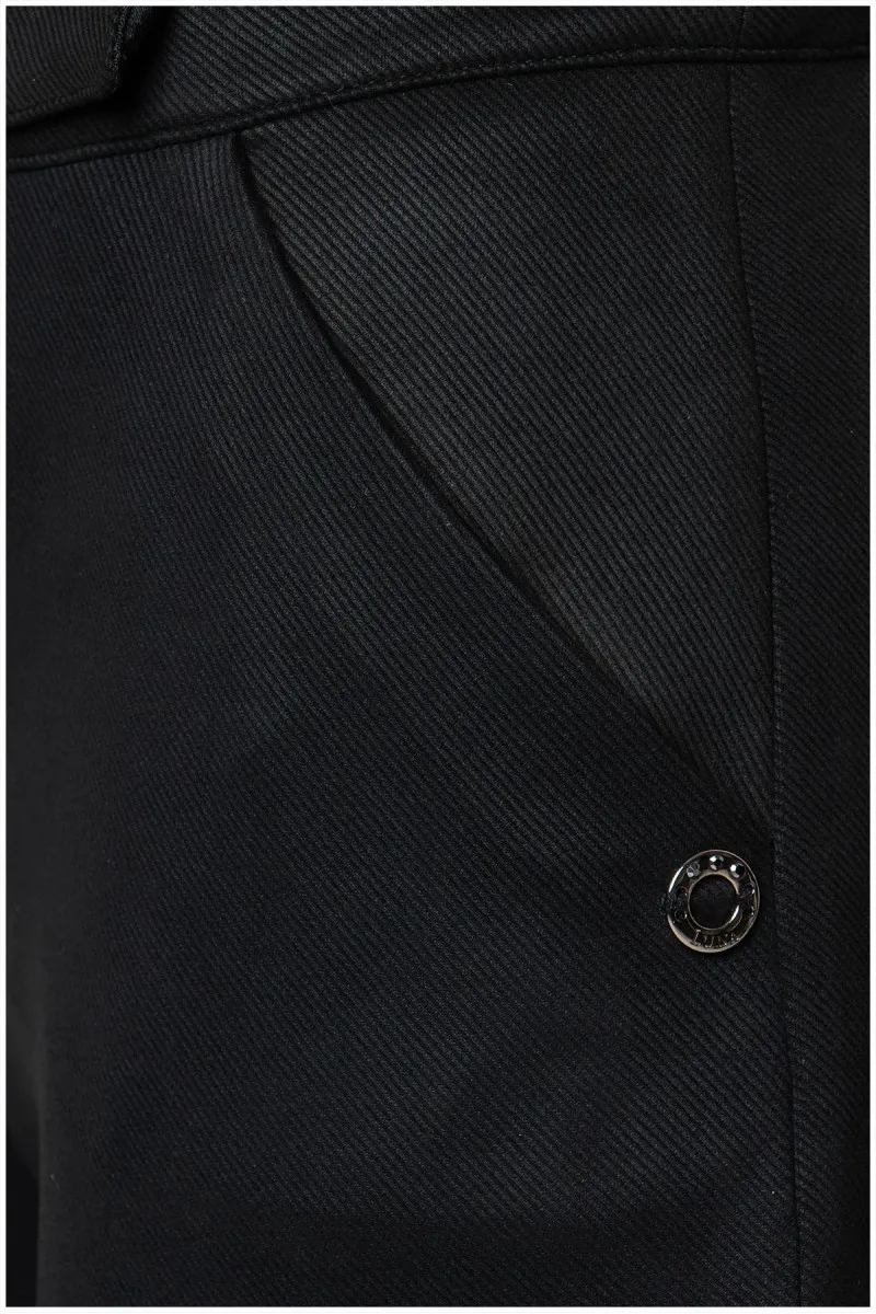 Crne elegantne pantalone ravnog kroja sa bočnim prorezima, laganim padom i glatkom, pri...