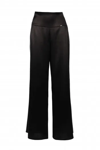 Crne elegantne pantalone ravnog kroja sa bočnim prorezima, laganim padom i glatkom, pri...