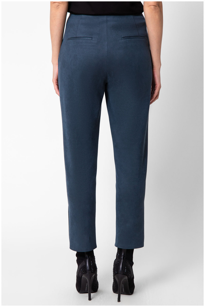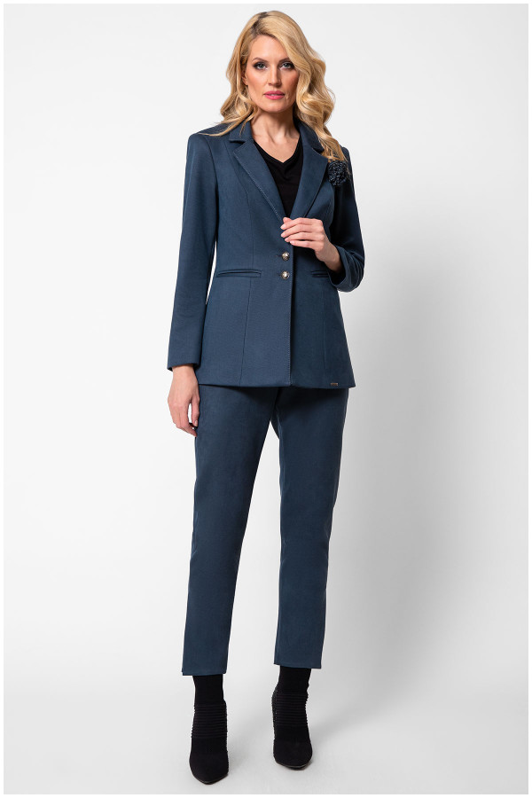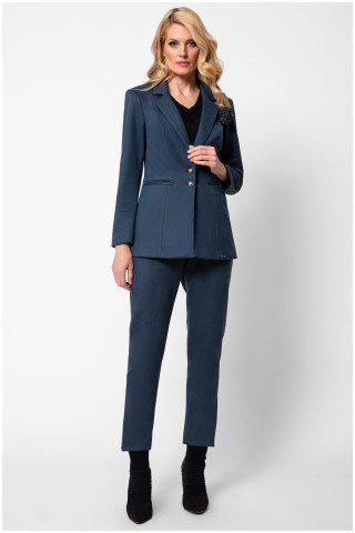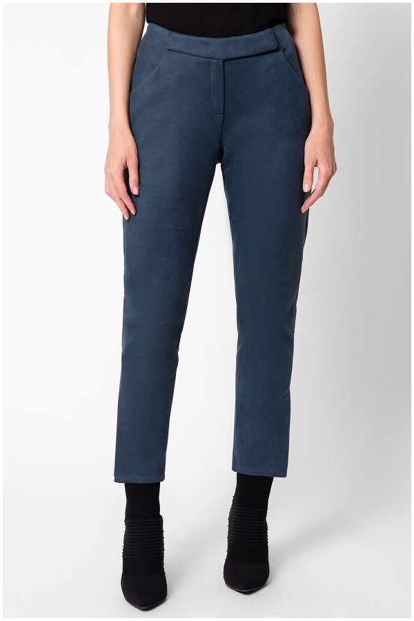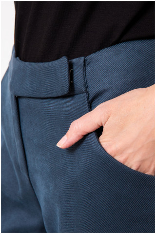 Elegantne pantalone dubljeg kroja sa bočnim džepovima. Model ima blago sužene nogavice i imitaciju paspuliranih džepova sa zadnje strane. Uparite ih sa sakoom iz iste linije za najbolji efekat.