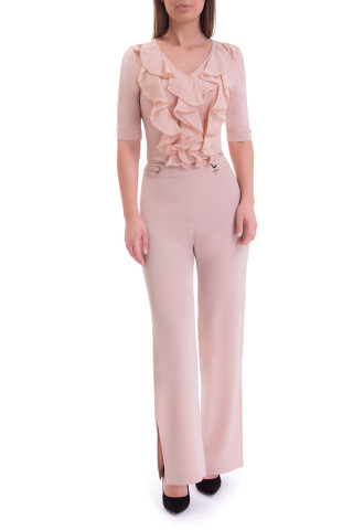 Elegantne pantalone ravnih nogavica od glatkog štofa.Pojas je dubok i ukrašen metalnim ringlicama na bokovima.U ovom modelu biće Vam veoma udobno čime doprinosi elastin u materijalu kao i sam kroj modela. Šlic u donjem delu nogavica daje posebnu notu atraktivnosti ovim pantalonama.Odabirom ovakvog modela uvek ćete imati šta da obučete u prilikama kada Vam je udobnost najvažnija.