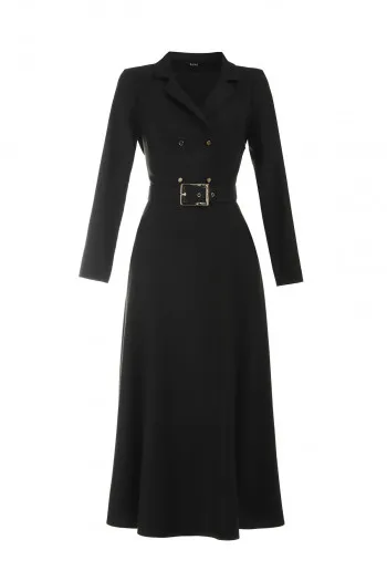 Crna svečana midi haljina sa V-izrezom, funkcionalnim dugmadima, odvojivim kaišem i lep...