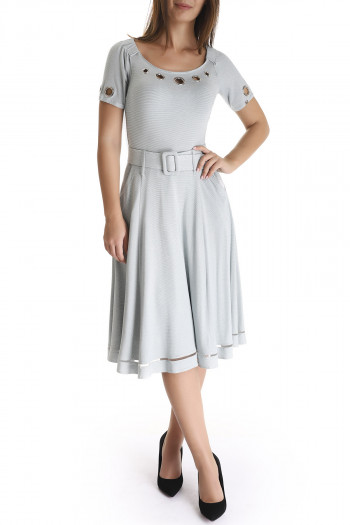Moderna uska haljina do kolena sa metaliziranim vlaknima i kaišem koji dodatno ističe V...