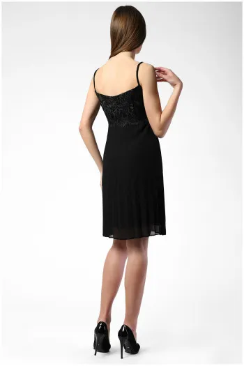Crna uska haljina sa spuštenim ramenima, naborima i nežnim cirkonima u središtu dekolte...