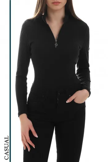 Crna polurolka sa kratkim rukavima oplemenjena jedinstvenim detaljem u predelu dekoltea.