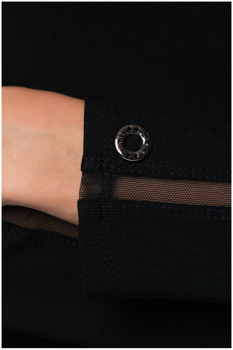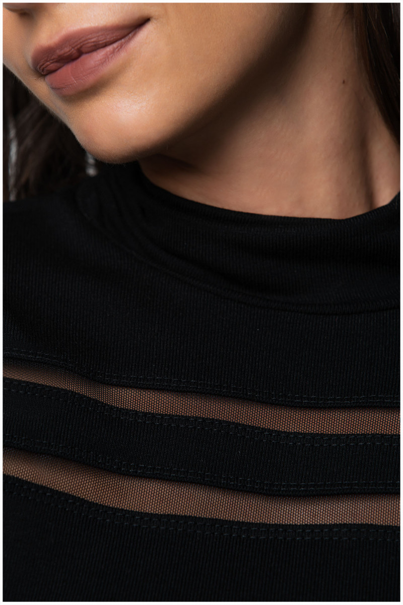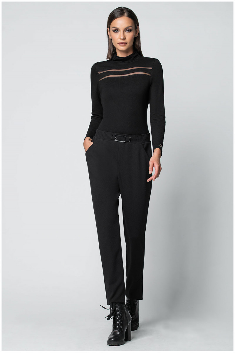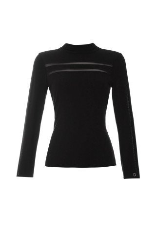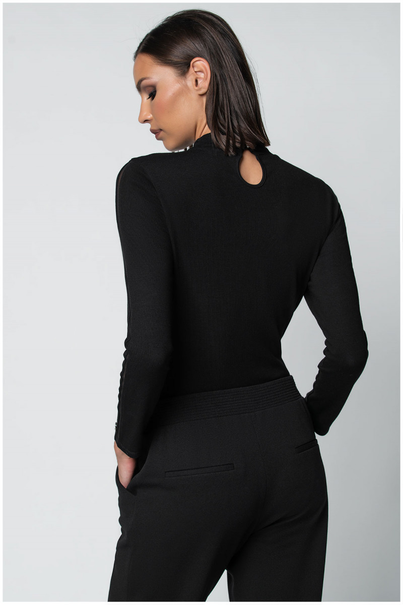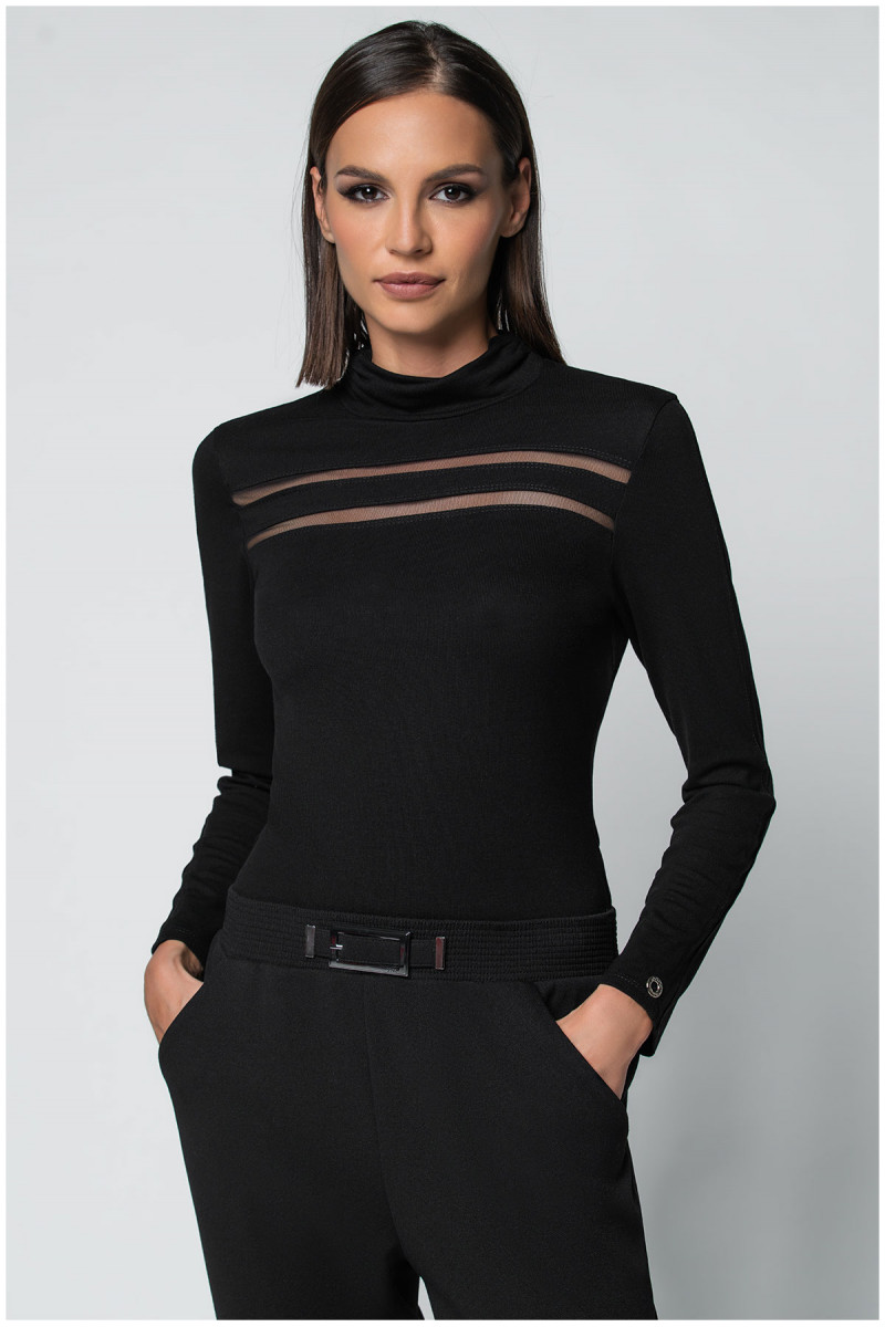 Viskozna crna rolka sa transparentnim trakama sa prednje strane i na rukavima. Klasičan kroj pristaje svim tipovima građe. Odlična je baza za formiranje outfita.