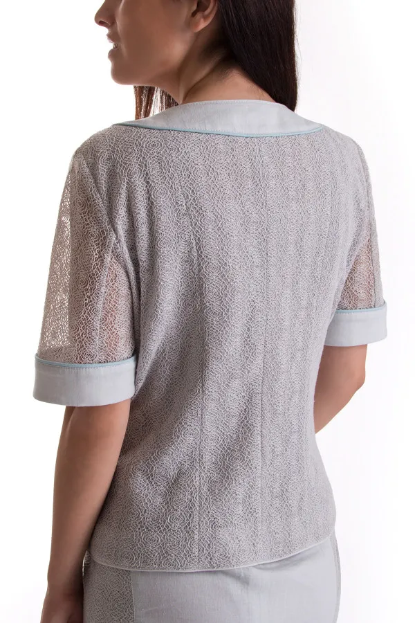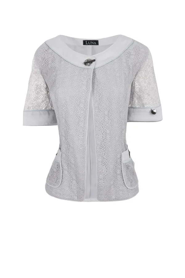 Strukirani sako kratkih rukava odlično pristaje svakoj figuri. Elastična čipka od koje je napravljen dodatno ističe eleganciju ovog modela, a neobično kopčanje sakoa upotpunjava vaš totalni izgled.